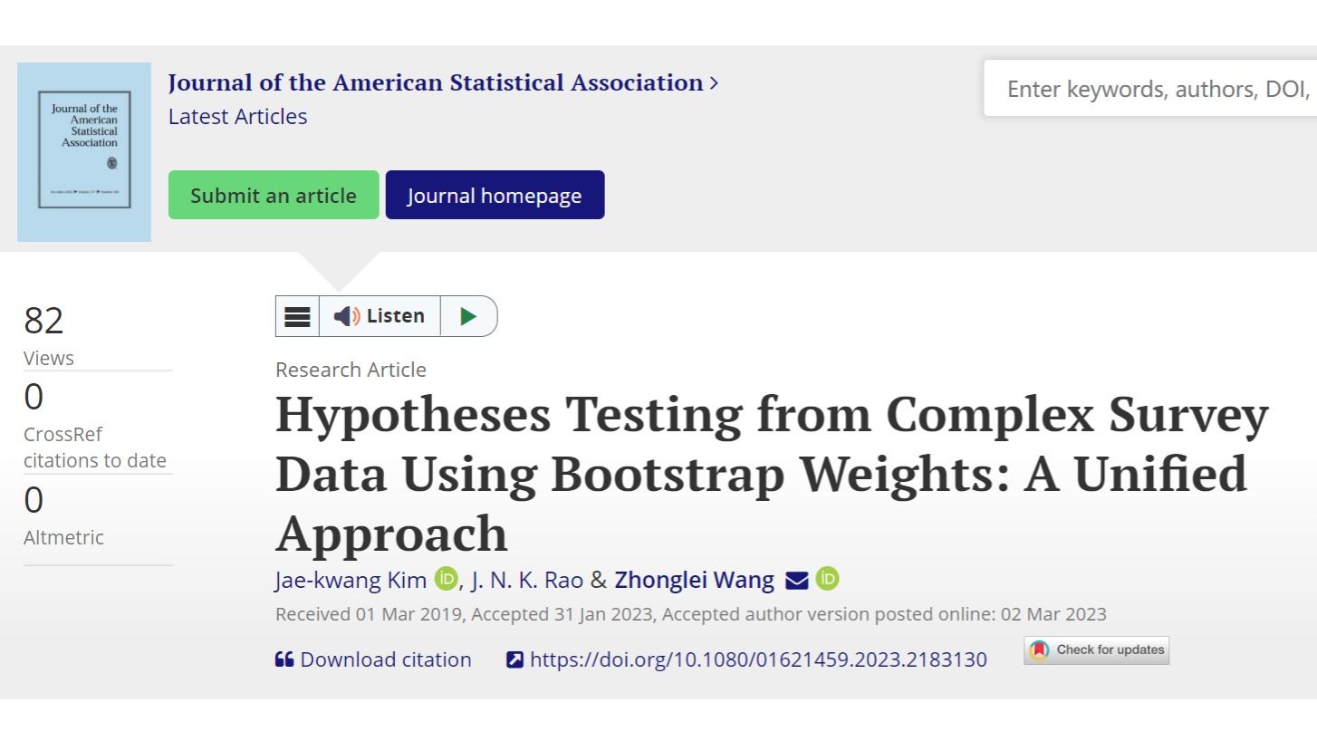 Kim, J. K., Rao, J. N. K., & Wang, Z. (2023). Hypotheses testing from complex survey data using bootstrap weights: A Unified Approach. Journal of the American Statistical Association, Onlin...