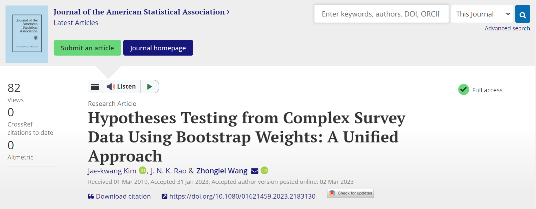 Kim, J. K., Rao, J. N. K., & Wang, Z. (2023). Hypotheses testing from complex survey data using bootstrap weights: A Unified Approach. Journal of the American Statistical Association, Online, 1-23.
