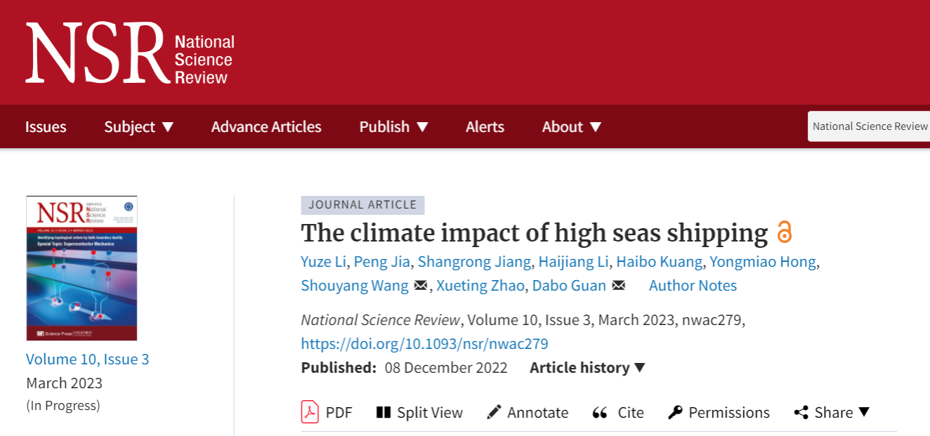 Yuze Li, Peng Jia, Shangrong Jiang, Haijiang Li, Haibo Kuang, Yongmiao Hong, Shouyang Wang, Xueting Zhao, Dabo Guan, The climate impact of high seas shipping, National Science Review, Volume 10, Issue 3, March 2023, nwac279, https://doi.org/10.1093/nsr/nwac279