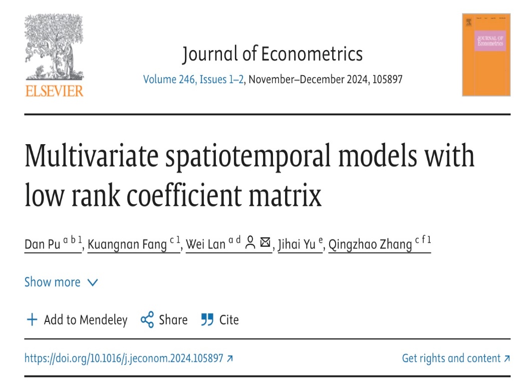 Recently, the paper “Multivariate Spatiotemporal Models with Low Rank Coefficient Matrix” was accepted by and published online in the Journal of Econometrics, a top international journal in economics and statistics. The paper is authored by Dan Pu, a PhD graduate of the class of 2023 from the Department of Statistics and Data Science of XMU School of Economics, in collaboration with her XMU supervisors Prof. Kuangnan Fang and Prof. Qingzhao Zhang, as well as Prof. Wei Lan from the Southwestern University of Finance and Economics (SWUFE), and Prof. Jihai Yu from Peking University. Dan Pu is currently a lecturer at the Statistics School of SWUFE. This paper is part of her doctoral dissertation, another work of which has been accepted by and published online in the Journal of Business & Economic Statistics. Journal of Econometrics falls into category A within the tiered international journal ranking list recognized by XMU College of Economics.