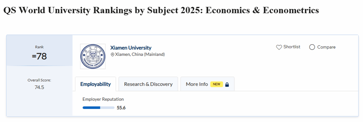 Recently, QS (Quacquarelli Symonds), a leading provider of data, expertise and solutions for the global higher education sector, officially released the QS World University Rankings 2025. Xiamen University is ranked 78th globally in the Economics & Econometrics subject, rising nearly 60 places compared with last year and entering the world’s top 100 for the first time.
