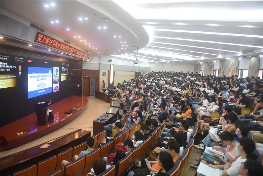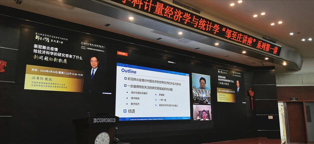 2020年9月29日,厦大经济学科计量经济学与统计学“邹至庄讲座”系列正式拉开帷幕,中国科学院预测科学研究中心主任汪寿阳教授应邀带来题为《谈新冠肺炎疫情对中国经济学研究带来的问题、挑战与机会》的首场讲座,吸引了近400名师生线下听讲,并有340余名师生线上注册参与,讲座由王亚南经济研究院(WISE)助理教授宋伟主持。