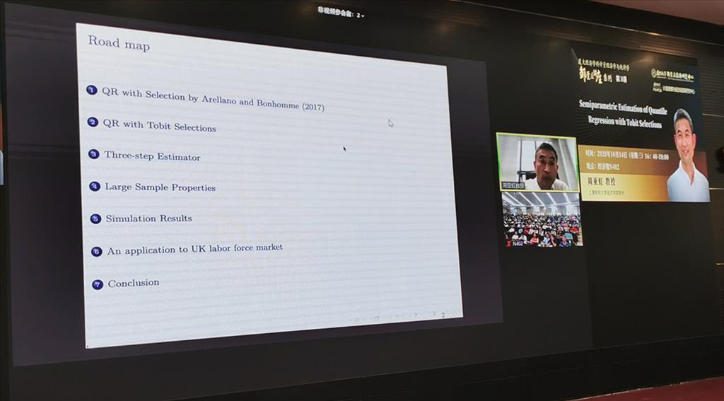 2020年10月14日下午,厦大经济学科计量经济学与统计学“邹至庄讲座”系列第三讲(暨高级计量经济学与统计学系列第123讲)开讲,上海财经大学经济学院院长周亚虹教授应邀为经济学科师生带来题为"Semiparametric Estimation of Quantile Regression with Tobit Selections"的全英文报告,详细介绍了如何利用半参数方法对基于Tobit选择的分位数回归模型进行估计的问题。讲座由厦门大学经济学院与王亚南经济研究院(WISE)林明教授主持。