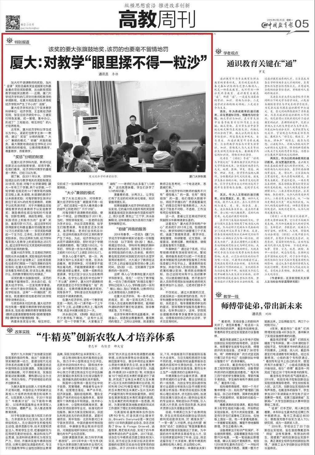近年来,厦大经济学科定位“双一流”、坚持育人为先,在创新教学管理体系方面努力探索,从细处着眼、从小着手,着力提升高校教育质量,并获得广泛认可。2019年2月,《中国教育报》曾以“厦大对教学‘眼里揉不得一粒沙’”为题,大半个版面报道了厦大经济学科多措并举调动教师积极性投入教学的做法和成效。文章指出,厦大经济学科以学生成长为中心,紧紧盯住教学主体——教师,通过“奖惩”分明的制度、“大小”兼顾的模式、“软硬”并施的服务,最大限度地调动起全学科231名教师的积极性,让大家敬畏教学、尊重教学、热爱教学。