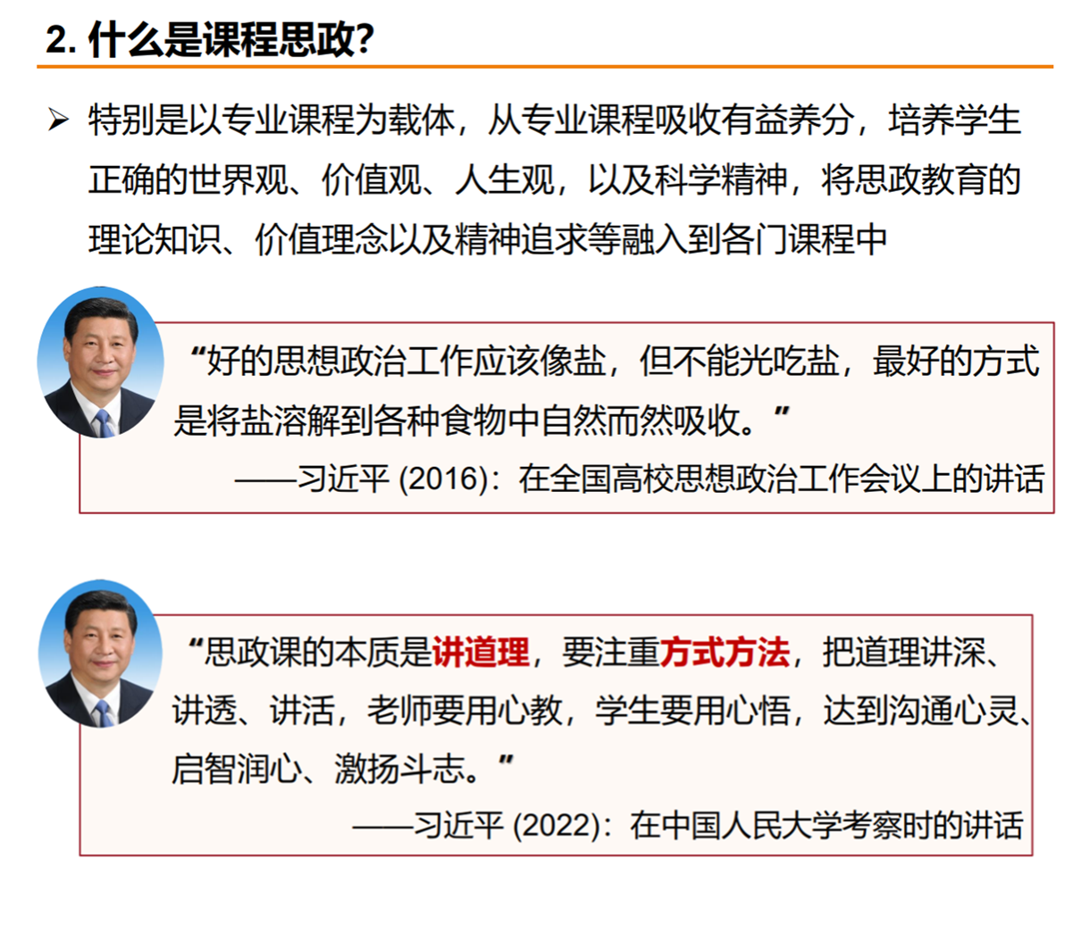 其次,洪老师介绍了课程思政与思政教育。思政教育就是对学生思想意识、政治观点、道德品质、行为规范、职业素养等的教育活动。习近平总书记曾说道:“好的思想政治工作应该像盐,但不能光吃盐,最好的方式是将盐溶解到各种食物中自然而然吸收”,“思政课的本质是讲道理,要注重方式方法,把道理讲深、讲透、讲活”。课程思政的内容选择是时代性与历史性的统一,其主要目的是实现知识传授、能力培养与价值思想塑造的有机统一。课程思政是中国高校人才培养的一大创造。作为一门方法论课程,《概率论与统计学》课程思政的主要目的就是培养学生的世界观和方法论,以及运用辩证唯物论与历史唯物论观察、分析与解决实际问题的能力。