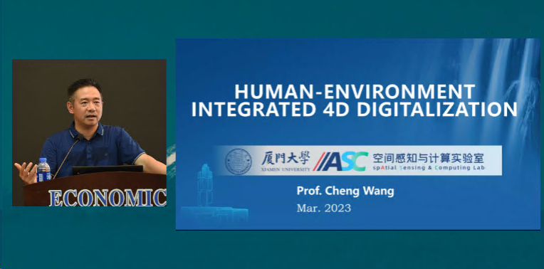 厦门大学信息学院王程教授带来题为“人在环境的4D数字化”的报告,展示了其团队关于4D数字化研究的进展。王教授认为人+车+环境的大范围空间动态感知开启了“数字孪生”的新时代,包括“如何利用高精度多传感器检测物体运动、如何利用激光雷达进行大规模视觉定位”在内的多个问题相继出现。王程教授首先从城市空间的数字化基础入手,介绍了“几何数字化、属性数字化和动态数字化”三大主体的特点,并进一步聚焦于其团队的关注点,从“基于激光雷达的三维目标检测与跟踪、人体动作捕捉、多任务场景捕获和三维视觉定位”四个方面展示了人在环境数字化下激光雷达的三维传感过程。他用过往实验中记录的一系列图片和视频,生动且直观地展示了如何利用激光雷达捕获人体动作、不同场景下激光雷达的应用以及激光雷达相对光学方法的优势所在,此外他还分享了其团队研究的具体进展和收获。