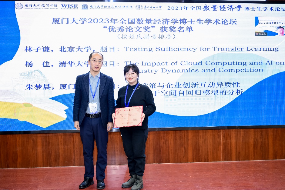 17日上午,优秀论文奖颁奖仪式在厦大经济楼举行,厦门大学王亚南经济研究院副教授赵敏强主持仪式。本次论坛将投稿文章分为三大类:计量统计类、金融类和经济类。北京大学林子谦获计量统计类优秀论文奖;清华大学杨佳获得金融类优秀论文奖;厦门大学朱梦晨获得经济类优秀论文奖。王维国、邱嘉平、齐鹰飞分别为获奖同学颁奖。