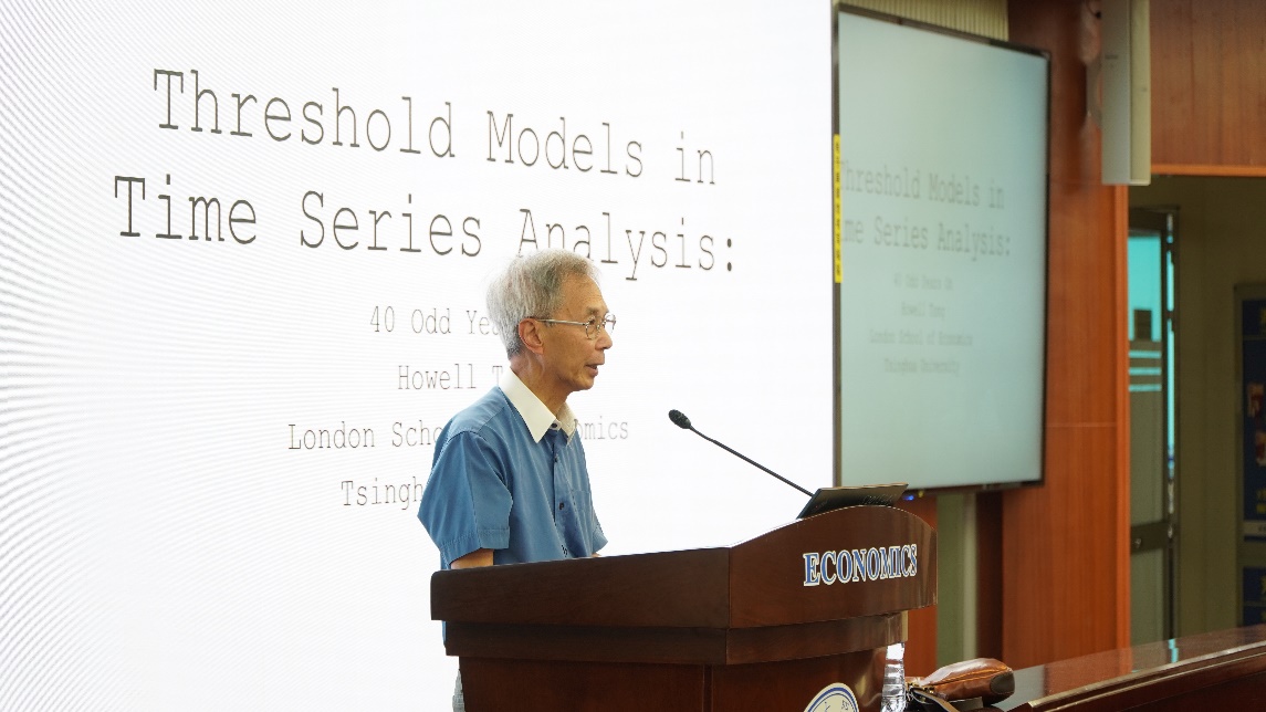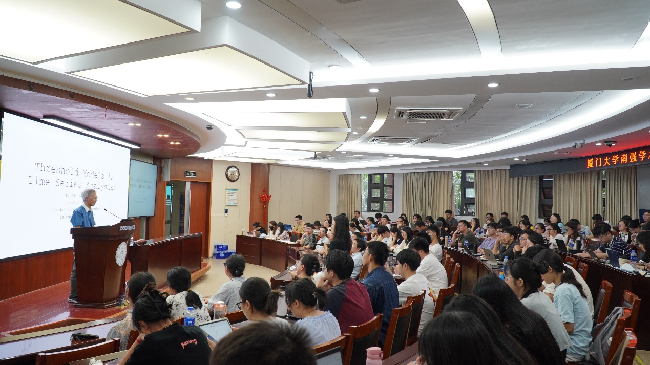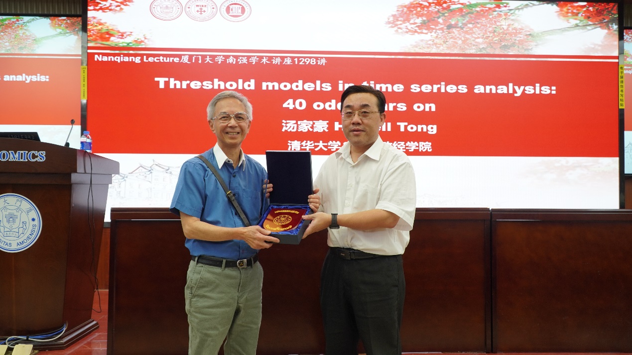 10月23日下午,清华大学杰出访问教授、英国伦敦政治经济学院荣休教授汤家豪(Howell Tong)莅临厦门大学经济学科,为同学们带来了一场题为“Threshold models in time series analysis: 40 odd years on”的厦门大学南强学术讲座。讲座由王亚南经济研究院、经济学院李木易教授主持,讲座开始前,经济学院、王亚南经济研究院院长周颖刚教授向汤家豪教授赠送了“厦门大学南强学术讲座”纪念牌。