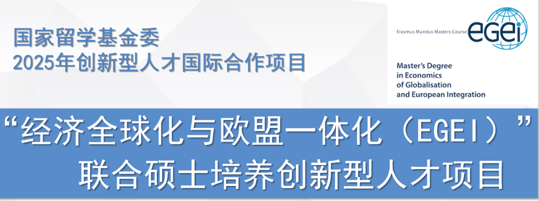 近日,国家留学基金委评审确定了2025年创新型人才国际合作培养项目,厦大经济学科 “经济全球化与欧盟一体化(EGEI)”项目自2019年和2022年分别获批后,第三次获得此项资助。本次资助的执行期为三年,资助规模为每年资助6名联合培养硕士研究生和2名访问学者,资助内容为一次往返国际旅费和资助期限内的奖学金。