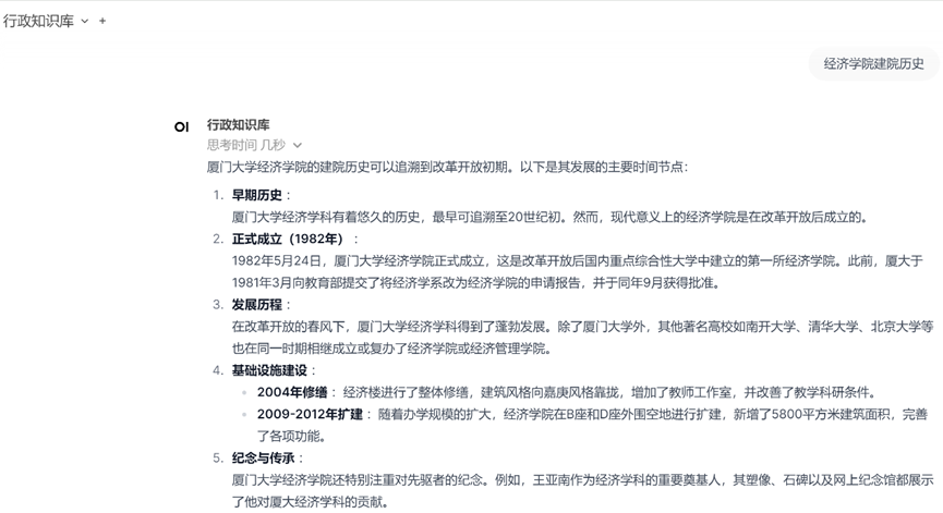 为进一步释放AI技术的赋能价值,经济学科将多年来积累的行政工作要点与师生关注的热点问题系统整合,构建了智能化的行政知识库,并全面接入人工智能平台。这一创新举措不仅为行政技术人员提供了高效、精准的决策支持,更实现了从“经验驱动”到“数据驱动”的转变。