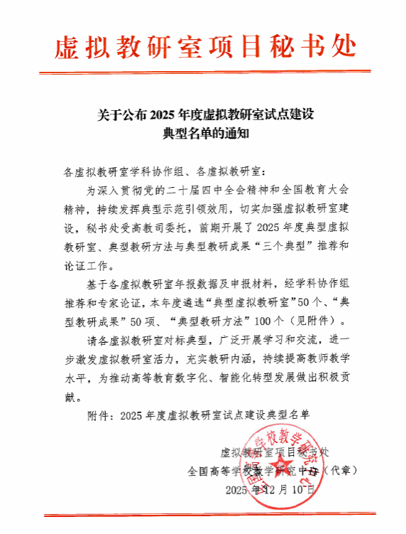 12月11日,虚拟教研室项目秘书处公布2025年度虚拟教研室试点建设典型名单,“101计划”计量经济学课程虚拟教研室入选“典型虚拟教研室”,成为全国50个获评典型之一。