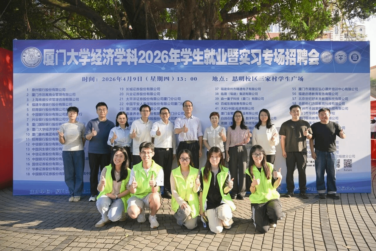 4月9日,厦门大学经济学科2026年学生就业暨实习专场招聘会在三家村学生广场举办。本场招聘会由厦门大学学生工作部(处)主办,厦门大学经济学院、王亚南经济研究院、邹至庄经济研究院,学生就业创业指导中心联合承办。