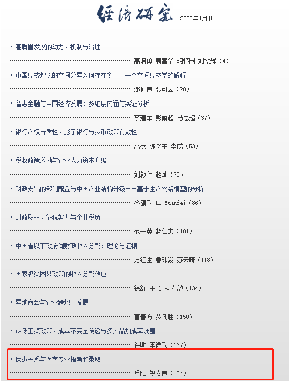近日,厦门大学经济学院经济研究所、王亚南经济研究院(WISE)助理教授岳阳(第一作者)、祝嘉良(通讯作者)合作的论文“医患关系与医学专业报考和录取”在《经济研究》2020年第4期正式刊出。