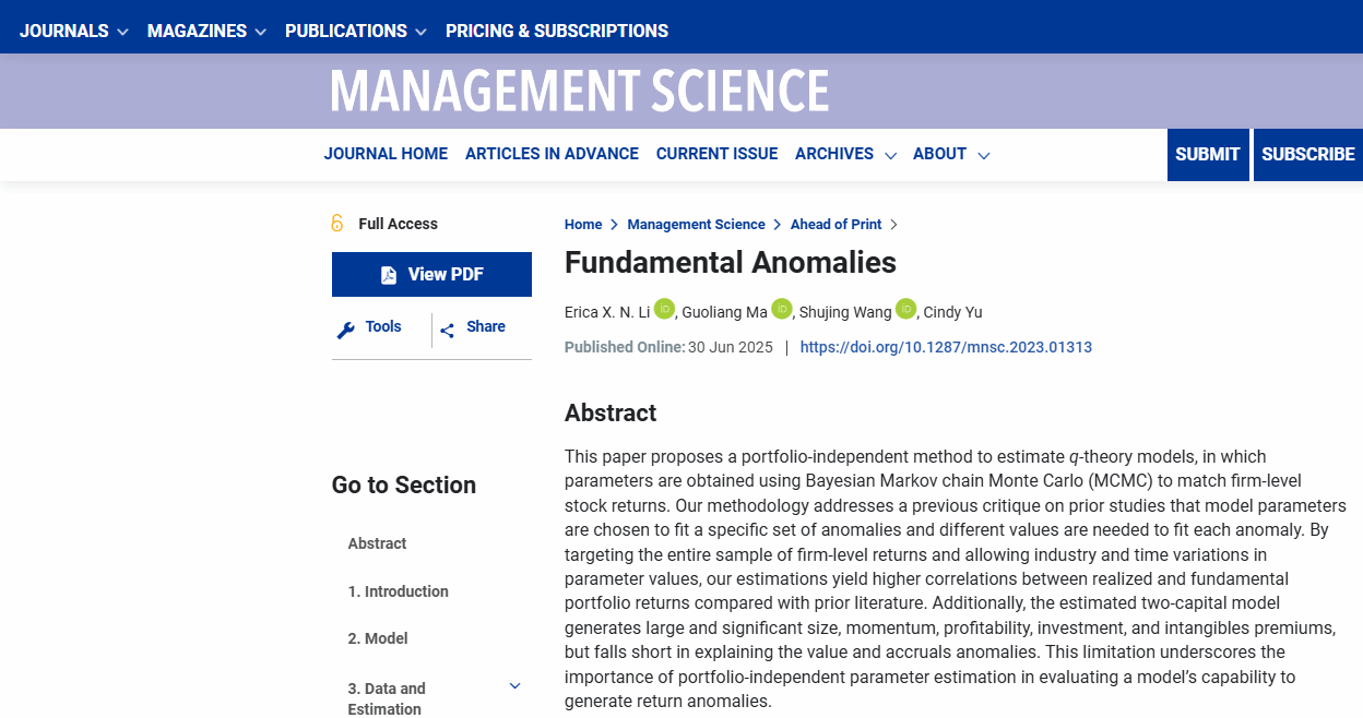 邹至庄经济研究院与经济学院金融系马国良助理教授,与长江商学院Erica X. N. Li教授、同济大学王姝晶教授、爱荷华州立大学Cindy Yu教授合作的题为“Fundamental Anomalies”的学术论文在管理学顶级国际学术期刊Management Science在线发表。