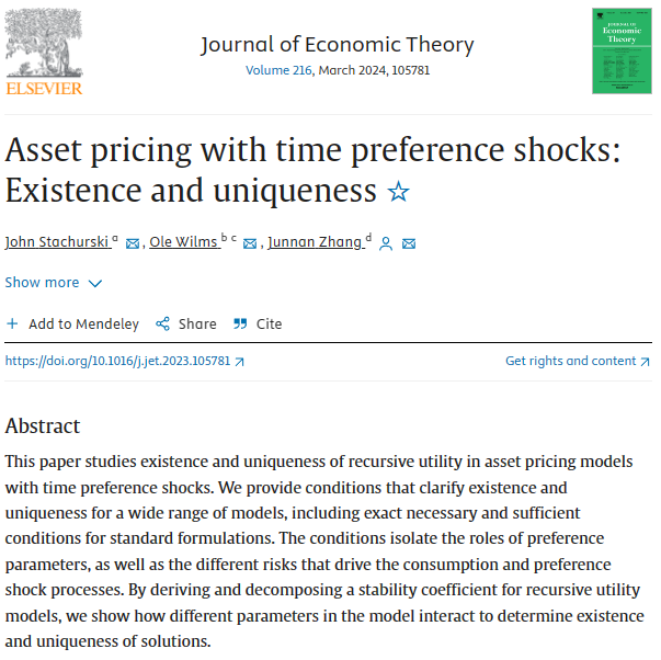 近日,邹至庄经济研究院宏观经济研究中心与王亚南经济研究院(WISE)双聘助理教授张钧南与澳大利亚国立大学John Stachurski教授,汉堡大学、蒂尔堡大学Ole Wilms副教授合作完成的论文“Asset pricing with time preference shocks: Existence and uniqueness”发表在经济理论国际顶级期刊Journal of Economic Theory 2024年216卷。