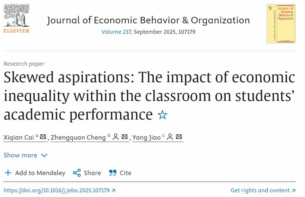 厦门大学经济学院经济研究所、王亚南经济研究院蔡熙乾教授与邹至庄经济研究院博士生程郑权、美国德克萨斯农工大学德克萨卡纳分校会计、经济与金融系助理教授焦阳合作的题为“Skewed aspirations: The impact of economic inequality within the classroom on students’ academic performance”的学术论文在Journal of Economic Behavior & Organization正式发表。该期刊是厦大经济学科认定的国际A-类期刊。