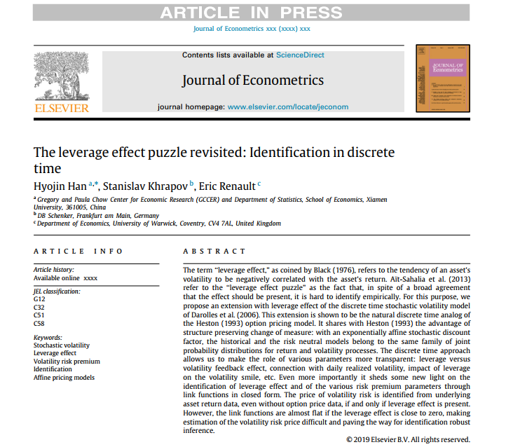 近日,经济学科青年教师Hyojin Han助理教授与德铁信可(DB Schenker)Stanislav Khrapov、华威大学Eric Renault合作的题为“The Leverage Effect Puzzle Revisited: Identification in Discrete Time”的学术论文在计量经济学世界顶尖期刊Journal of Econometrics在线发表。