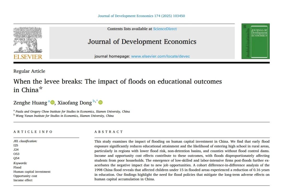 近日,由邹至庄经济研究院区域经济学专业2021级博士生黄增鹤与其导师董晓芳副教授合作完成的题为“When the Levee Breaks: The Impact of Floods on Educational Outcomes in China”的论文正式发表于发展经济学顶级刊物Journal of Development Economics,该刊也是厦大经济学科认定的国际A类期刊。