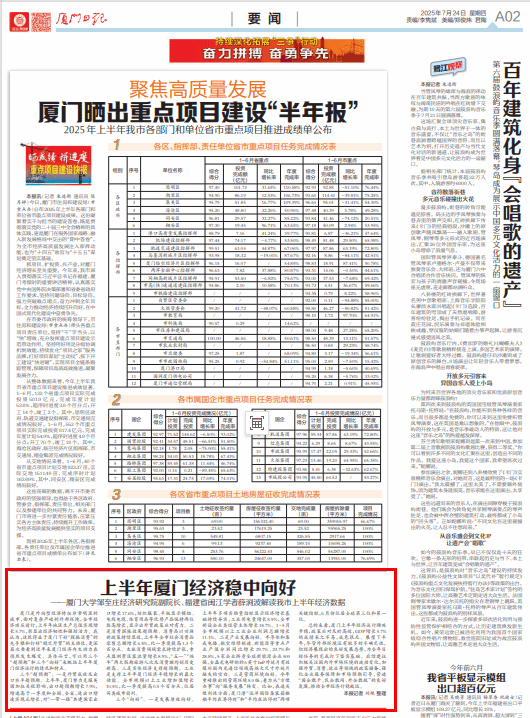 2025年7月24日,厦门大学邹至庄经济研究院副院长、福建省闽江学者薛涧坡教授在《厦门日报》A02版“要闻”刊发《上半年厦门经济稳中向好》一文,解读厦门市上半年经济数据。以下为该文全文。