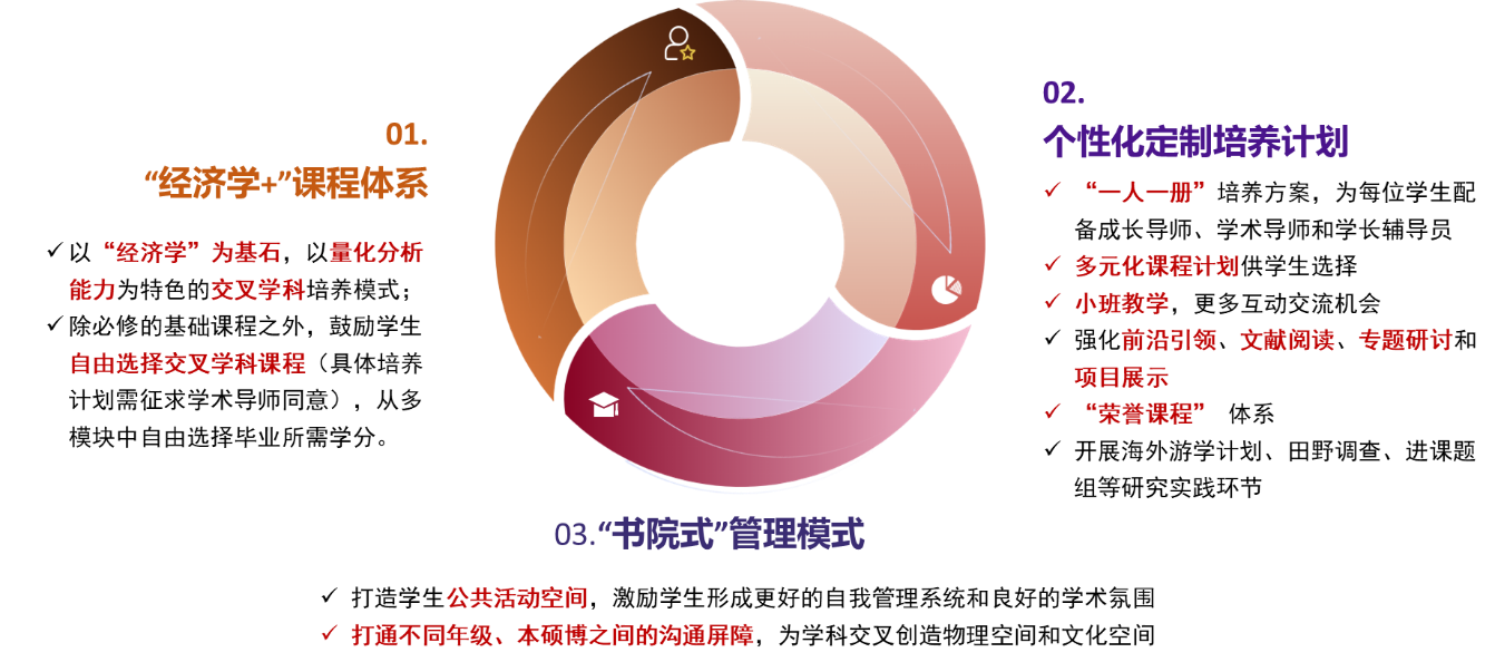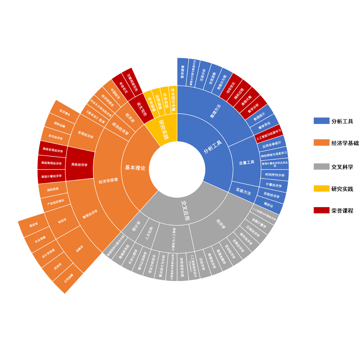 课程体系在兼顾通识和基础的同时,加强对于计量经济学等定量分析工具的学习,加强对于中国经济实践的理解,加强对研究兴趣和研究能力的培养。体现了习近平总书记提出的充分借鉴和利用先进研究方法,同时不忘老祖宗,保持科学判断力的要求。